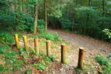 山火事注意の横断幕 8時48分 ここを通り過ぎるとすぐに車両通行止めの杭に出会う。この杭をすり抜けて進む。 右手の杭の方へ