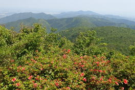 8、鈴ヶ岩屋(すずがいわや) 11時22分 真っ赤なヤマツツジの向こうは福智山山頂 |