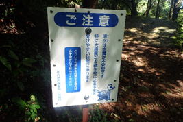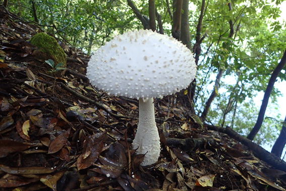 大きな白いキノコが標識の前に陣取っている・・・・・傘の直径、20センチはありそうだった。 |