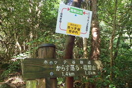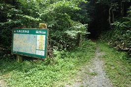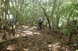 | 荒宿荘から5分程進むと分岐に出会う。左右どちらに進んでも山頂に通じている。 |