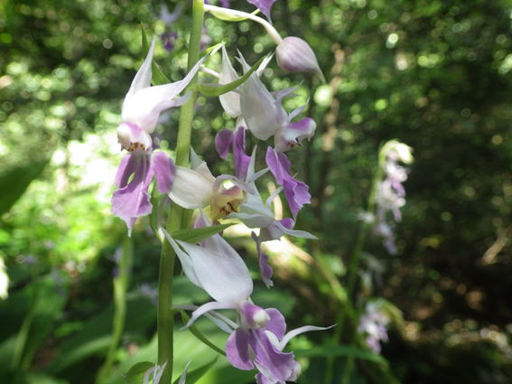 今夏久しぶりのお天気に恵まれた。「夏はやっぱりこうじゃないと!」 毎年この時期になるとナツエビネの季節、木漏れ日を浴びて踊るような可憐な花は、なかなかお目にかかれない。 |