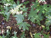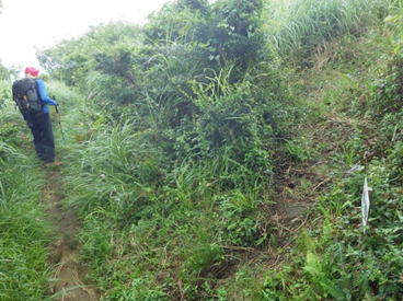 この場所はつい最近まで森林伐採が行われていた場所である。その伐採の為に整備された林道が登山道と交差している。日当たりがいいので花が目立つようになった。 |