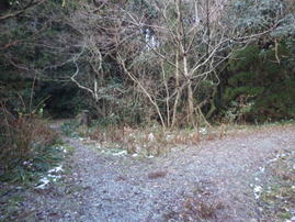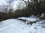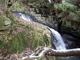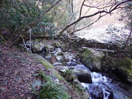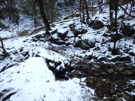 7、たぬき水 11時20分 ここも辺り一面真っ白。チョロチョロと水が流れ出る。飲まずに先へと進む。 寒々しい |