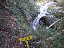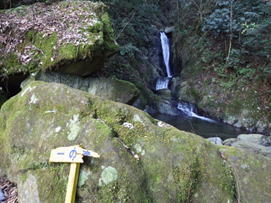 分岐に出会う 右へ 8時48分 「一の滝」を見終わるとすぐ左に分岐がある。ここから右に進めば、鎖場を経て二の滝へ、左の迂回路に進めば、三の滝の手前に出る。 右の鎖場へ |