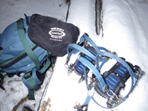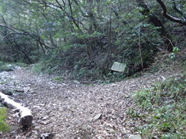 11、大杉渡り 13時19分 沢の部分を除いて一面雪に覆われている。この沢は水量が少なく、気楽に渡ることが出来る。この先のベンチでアイゼンを外した。 小さなプレート |