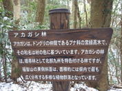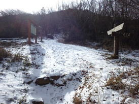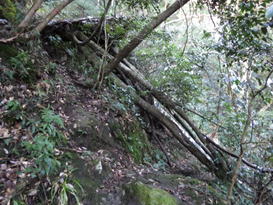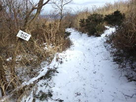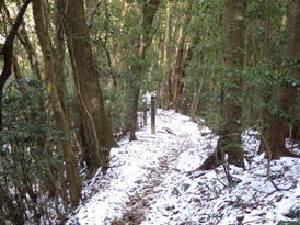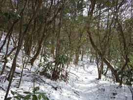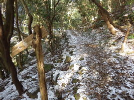 アカガシ林を歩いていると・・・ 13時37分 1.8のコルに到着する寸前、左下の谷でガサガサと音がした。樹木の間から谷底を見ると、真っ黒で大きなイノシシが三頭。小走りで林の中へ逃げて行くのが見えた。写真を撮ろうとカメラを構えたが撮影は無理だった。 雪の中、谷を走る黒いイノシシの姿はちょっと異様に感じた。登山道の方に上って来ないだろうかと、内心焦った。 |