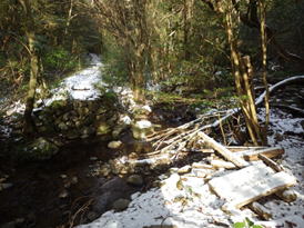 迂回路へ 9時54分 橋が倒壊していてどうしようかと思ったが、5メートル程左に迂回渡渉場があった。ネットに石が入れられてとても歩き易い。感謝! ナイス! |
