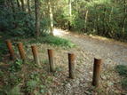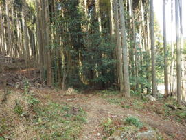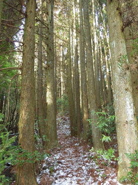 | 14時17分 杉木立の中に太陽光。 気分よく下って行く |