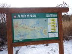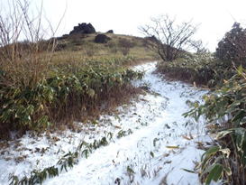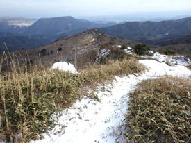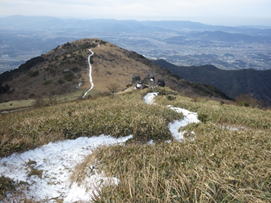 福智山山頂 登山道には雪が残り、登山道が白く浮かび上がる。
