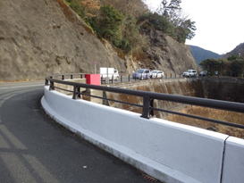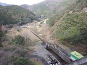 車両通行止めゲートを越える 15時05分 このゲートの向こうに「ます淵ダム管理所」が見えている。堰堤もすぐそこだ。 ここから堰堤 |