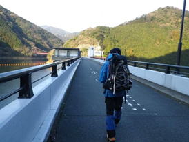 1、鱒渕ダムの堰堤を歩いて出発 7時45分 |