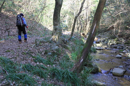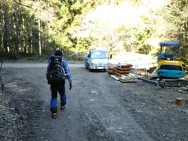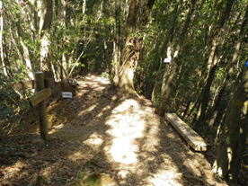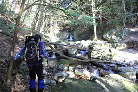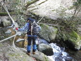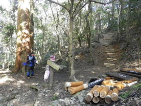 10、大杉渡り 12時53分 大杉渡りから少し下ったところで休憩。 鱒渕ダムから福智山への九州自然歩道は補修工事中だった。 サングラスの落し物 |