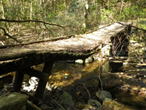壊れかけた木の橋 9時30分 以前は渡ることのできた橋も年月がたてば寿命がくる。どう見ても危ない橋なので橋の右手に下りて川の浅瀬を歩いて渡る。 今にも倒れそうだ |