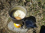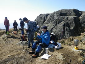 大岩で風を避けて昼食 11時40分 今日は平尾台の野焼きの日なので、立ち昇る野焼きの煙を見物しながら昼食だ! チャンポン |