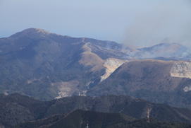 平尾台の野焼き 12時08分 煙の中から時折赤い炎も見える。 山肌は真っ黒に変身して平尾台も春を迎える準備が整ったようだ。福智山頂の登山者はのんびりお弁当を食べながら野焼きを観賞している。日当たりもいいので皆さんゆっくりしている様子。 二週間前の山頂は一面雪に覆われていた。それを思うと嘘のような気候だった。 |