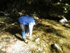 広い河原に行き着いた 9時15分 次はこの川を渡ることになる。 水量が多いのでルートを慎重に選んで岩を渡って行く。 バランス良く |