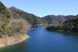 美しいダム湖にうっとり 14時32分 赤い橋の上から青く輝く湖面を見つめる。 のんびり |