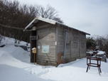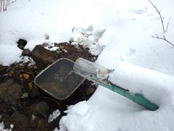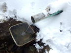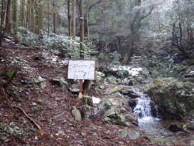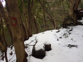 たぬき水に寄り道 11時28分 水量は少ない。取りあえず飲んでみたが、あまり冷たく感じなかった。 コップは雪で埋まっていた。 チョロチョロ |