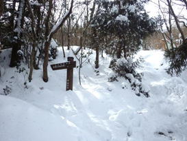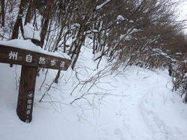 3、山瀬越 9時54分 頓野林道から3分位林の中を歩くと九州自然歩道の尾根道に出た。雪の影響か、無雪期に歩いた時と比べて30分程度遅れていた。 福智山は右へ |