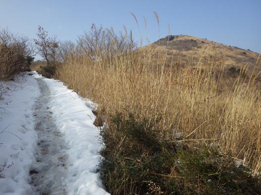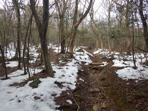 右奥の福智山が徐々に近づいてくる! 雪が残った道を滑らないように慎重に進んだ。