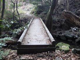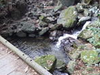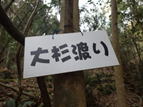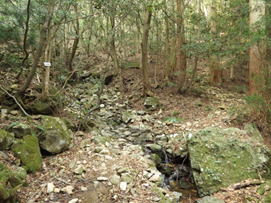 大杉渡り 10時27分 自分以外誰もいない。静まり返った森に小さな沢の音が響き、とても雰囲気が良い場所である。その小さな沢を渡って更に進んで行く。 大杉のある場所 |