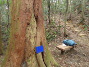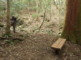 大杉渡りのベンチ 10時26分 1.8のコルから調子よく大杉渡りまでやって来た。 ここで水分補給して先に進む。 山頂まで1.2km |