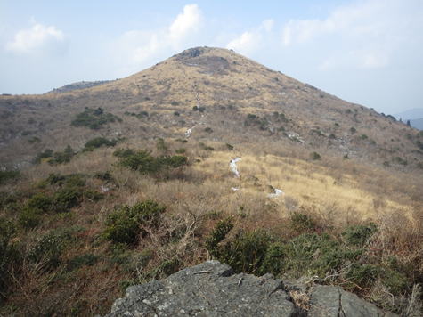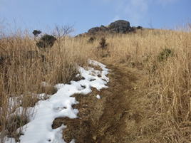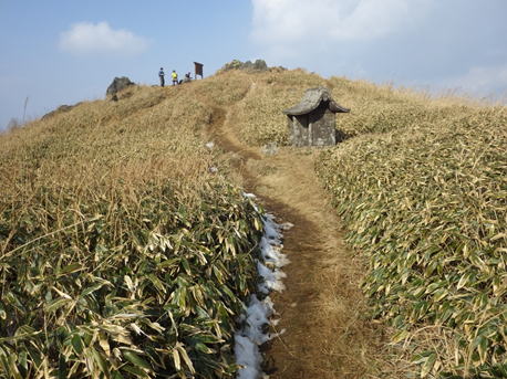 | 4、福智平から福智山山頂を望む 11時01分 あともう一息で山頂だ! 新設された標識では、ここは福智平ではなく、「鈴ヶ岩屋」という地名になっていた。 |
