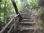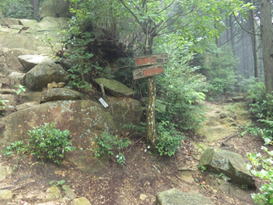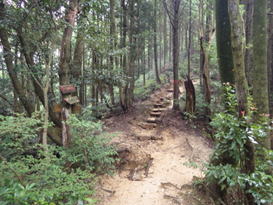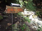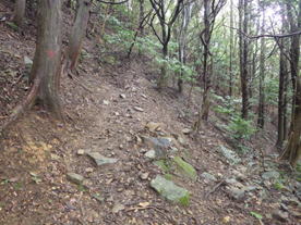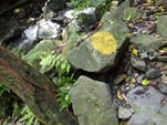 ここから少し下ると林道に出る。その林道を横切りまた登山道を進むことになるが、かなりの急坂で滑りやすく注意が必要だ!急坂を下って行くと程なく沢に出る。ルートはこの沢沿いに下って行くのだが、ルートをよく確認しないと「アレっ、どっち?」と言うことになる。岩に印された黄色のペンキがとても有り難い。見逃さないようにしよう! |