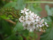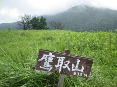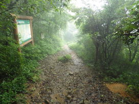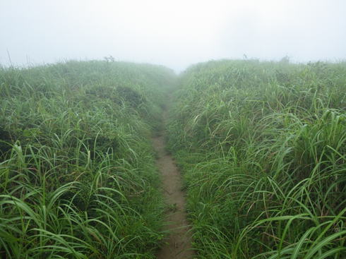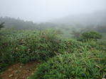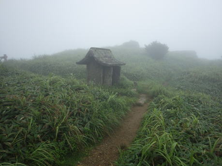 本来なら正面に福智山の山頂を見ながら歩く場面だが、濃霧で福智山の姿は全く見えない。足下の花の撮影をしながら、どこを歩いているのかもよくわからず進んでいると・・気が付けば八丁の辻を通り過ぎてクマザサ帯の横を歩いていた。やはり霧は感覚を鈍らせる。「もう少しで山頂だろう」と思った瞬間に福智神社上宮が目の前に現れた! |