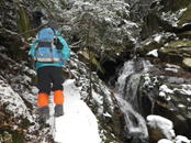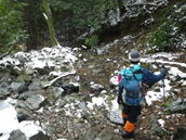 アイゼンを外す 13時08分 川で登山靴を洗いアイゼンを外した。 更に下って行くと川を何度か渡ることになる。 ルートを視認 |