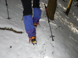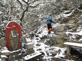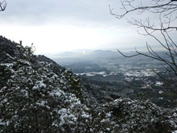 さっそく急登に喘ぐ 8時22分 噂には聞いていたがかなりの急登だ。 しかも足下は一面雪に覆われて滑りやすい。 下界を望む |