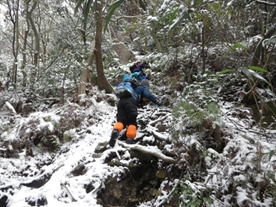 急登は続く 9時39分 林道から更に急登は続いた。ロープをしっかり握り、滑らないように一歩一歩進む。 ロープを手に |