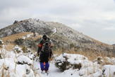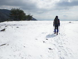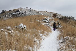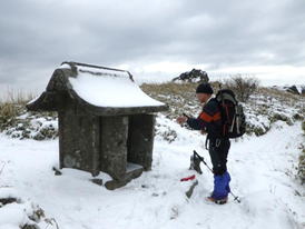 福智山に向かう 10時20分 福智山頂が目の前に現れると、これまでの急登の疲れもすっかり忘れて元気が涌いてきた。 無風で穏やかな気候に恵まれ、八丁から福智山頂までの道中は、美しい雪景色、遠くの山並み、下界の景色を堪能しながらゆっくりと歩くことが出来た。 この安堵感、充実感、解放感の中で歩くスローな時間が実に楽しい。 |
