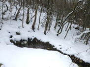 樹林帯の中に入って行く 11時35分 途中で左手に水場がある。チョロチョロと水が涌いている。鍋が一つ置いてあった。 水場 |
