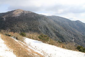 八丁を望む 12時32分 鷹取山山頂から今朝必死で上った八丁の急登を確認した。中腹に「おおつが林道」が見えるが、そこから八丁の山頂を見ると急登なのがよく分かる。 八丁の山頂のすぐ左にほんの少しだけ福智山の山頂が顔を出している。 360度の景色を堪能した後、下山に取り掛かかった。とても温かく感じる山頂だった。 |