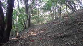 | 鷹取尾根の難所 9時10分 ロープが張られた急坂がある(約100m) 勾配か急で、足下がズルズルと滑りとても歩き難い この急坂をクリアするとあとはまた緩やかな勾配の尾根歩きに戻る。 |