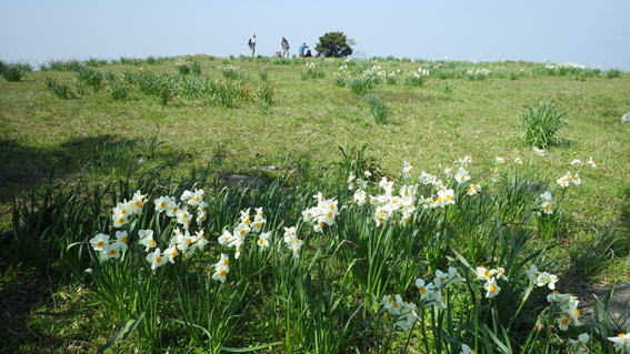 分岐を右に曲がって3分程で鷹取山の山頂に到着した。水仙が気持ちよさそうに揺れていた。