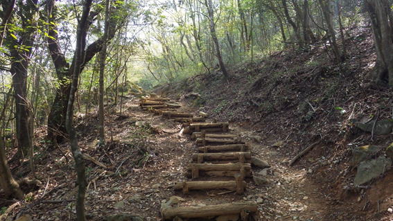 | 木段も一歩一歩 10時32分 ゆっくり焦らず この時間は既に下山してくる人も多い。今日は登山者が多く、何人もすれ違う。 |