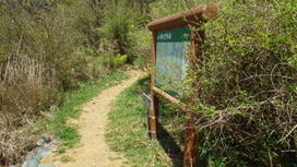 朽ちた説明看板 13時06分 ダムまで60分 |