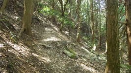 尾根の途中で、先行していた3人の登山者が休憩をしていた。挨拶を交わし私が先行することになった。疲れも知らず、40分程快適な尾根歩きが続く。この尾根は本当に気持ちがいい。知る人ぞ知る絶好の尾根歩きスポットだ。他の登山者も殆どいないので、森を一人占めした気分になって山歩きに浸れる空間でもある。但し、途中一か所だけ難所がある。 |
