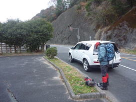 1、鱒淵ダム 7時40分 鱒淵ダム横の路肩に車を停め、準備を整え出発。 車は7台 |
