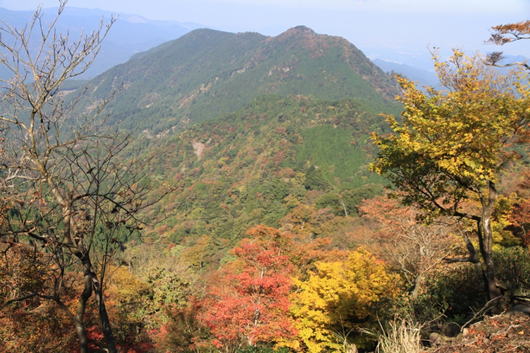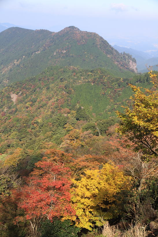 紅葉した樹林の間から英彦山を望む 9時20分 とても綺麗だ