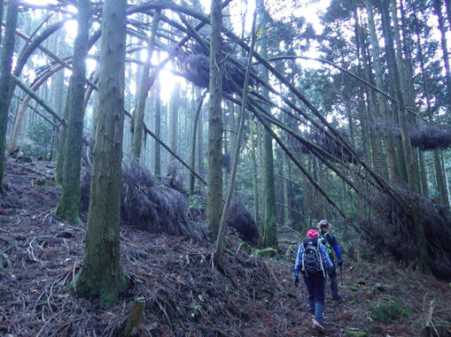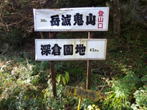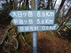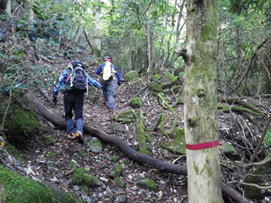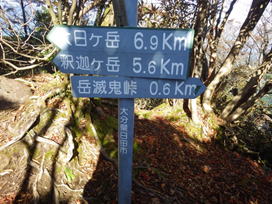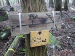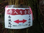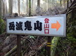 岳滅鬼峠の標識 目指す岳滅鬼山は右へ。左に進むと籠水峠と表示されている。H師匠が「籠水方面はちょっと怖いところが・・」と呟いた。 鬼杉に通じる籠水峠方面は<難・荒路>と書いてあり、落ちたら終わりの難関の岩場があるそうだ。一般の方は行かない方がいいだろう。私も行ったことはなく、想像するだけだがたぶん尻込みするだろう。 |