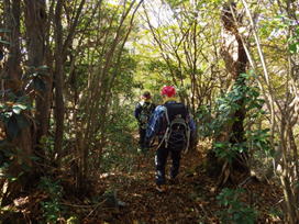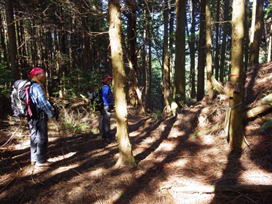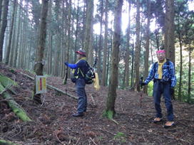 植林の中を歩く 7時51分 最初はわかり難かったコースも何となく分るようになってきた。 先頭を歩くH師匠とK高さんは、赤テープを確認しながら快調に歩を進める。おかげで私は何も考えずについて行くだけだ。 しかし、私にとっては二人のペースが少々速いので必死だ!気が付くと汗がポタポタと落ちていた。 |