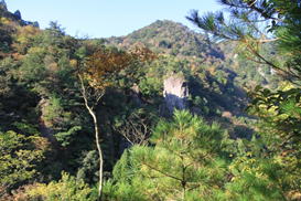 シークレットビューポイント 8時11分 黒岩山への分岐表示を背に小高い丘がある。そこはH師匠お勧めのシークレットビューポイントだ。「行ってみよう!」とそこに寄り道をした。渓谷を挟んで障子ヶ岳方面を見ると、迫力あるバッドレス(垂直に近い岩壁)が目に飛び込んでくる。以前はよく見えていたそうだが、現在は木々が茂り視界不良だ! |