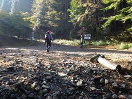 林道が分かれるが左へ進む 8時46分 小屋を過ぎるとすぐに林道が二手に分かれる。林道沿いの左の木に黄色いテープが巻かれているので、左に進むと判断する。 左へ進む |