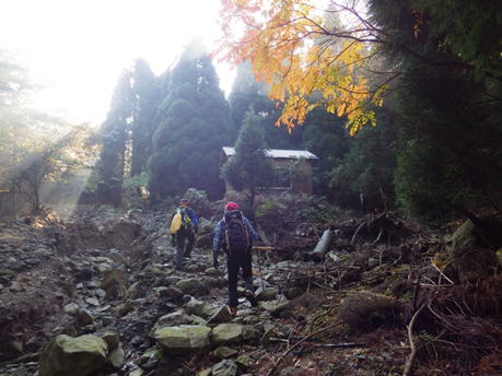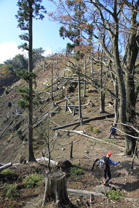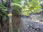荒れた林道支線 8時43分 もはやこの道は林道とは呼べない。ガレ場である。 |