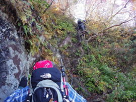 ほぼ垂直な崖を上る 9時48分 ロープに頼らず三点支持を忘れずに!