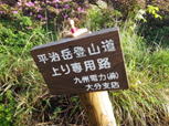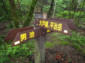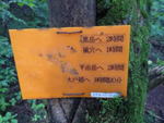 | 上り専用路を上り詰めるとそこは南峰山頂直下となる。岩場の方に歩くとすぐに下り専用路の標識がある。ここからは三俣山が見えるはずだが、ガスがその雄姿を見せてくれない。 |