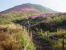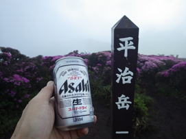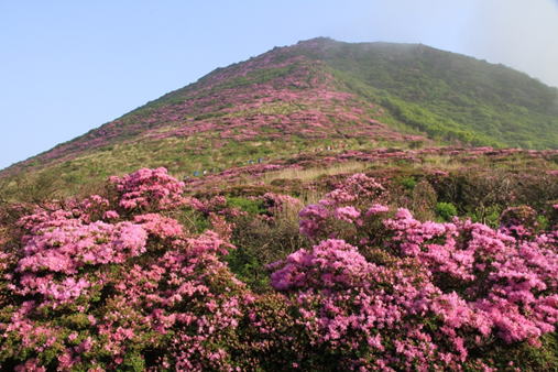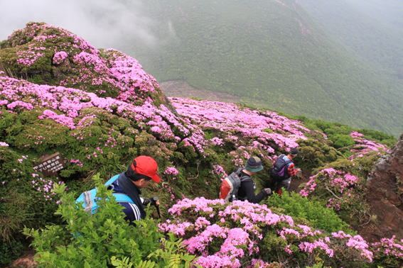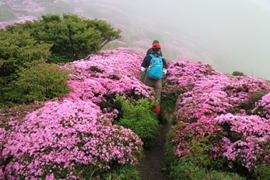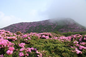 平治岳山頂より本峰斜面を望む 8時11分 霧の中で咲き誇るミヤマキリシマ |